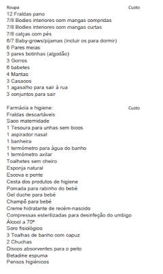 Ainda não sei muito bem tudo o que levar... mas fui fazendo um levantamento de listas de outras mães que vi em fóruns e assim... Deixo-vos aqui as listas: (se quiserem envio por email em excel!)